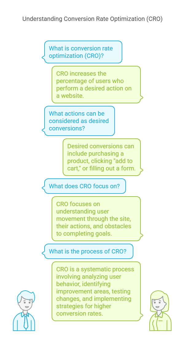 Conversion rate optimization (CRO) increases the percentage of users who perform a desired action on a website. This desired conversion action can include purchasing a product, clicking "add to cart," or filling out a form. CRO focuses on understanding how users move through your site, what actions they take, and what's stopping them from completing your goals. CRO is a systematic process that involves analyzing user behavior, identifying areas of improvement, testing changes, and implementing strategies that lead to higher conversion rates.